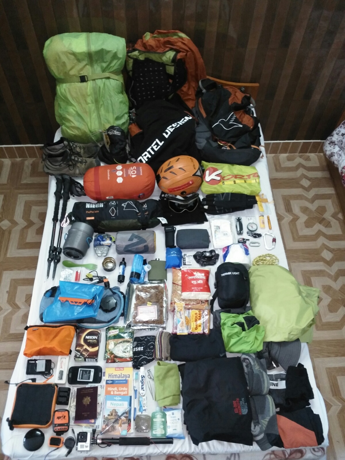 I end up with a 21.6kg bag, without water, which is okay considering I have a tent, mattress, big sleeping bag and all I need to fly and survive in the mountains.