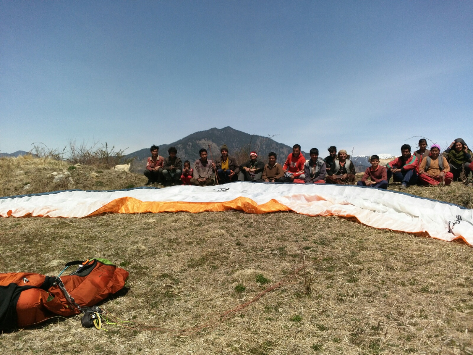 I think more than 200 persons are here, I'm trying to calm down while packing before the rain, but they only want to talk to me. Hey! I'm the first paraglider pilot to come here, of course they're curious! So I talk to one school teacher, I need 15 minutes to pack before the storm, then I'm yours.