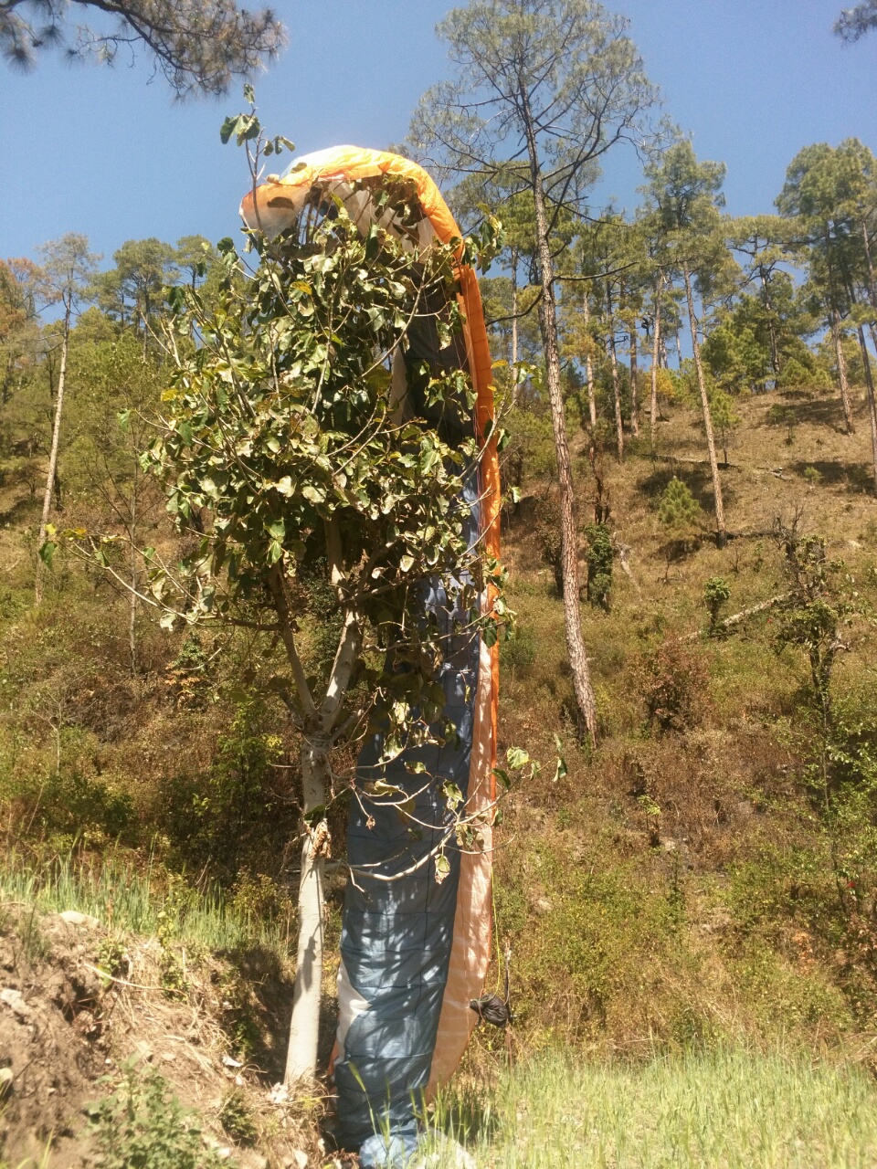 I land safely in a small field, the only landing option around here. I'm safe on the ground, but the wing decided that a nearby tree needed a new decoration. Oh well, here goes my day!